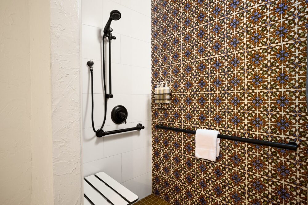 Chic one king bed guestroom with roll-in shower and Spanish-inspired design.