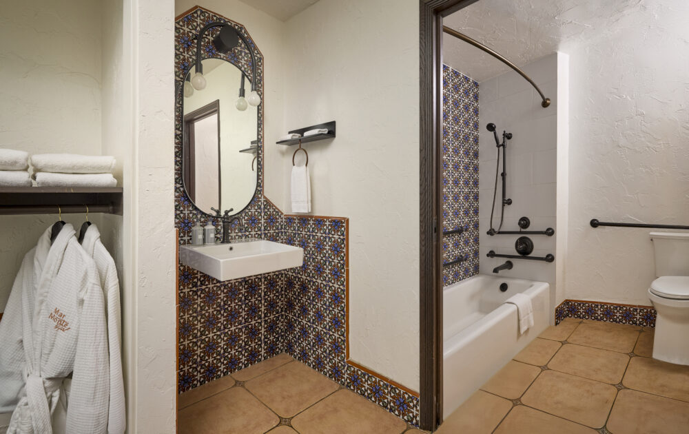 Two queen beds guestroom with accessible tub and Spanish-inspired design.