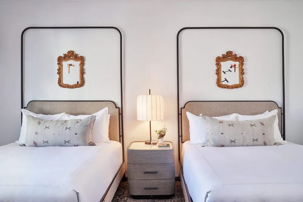 Chic two queen beds guestroom with lush bedding, spacious bathroom and Spanish-inspired design.