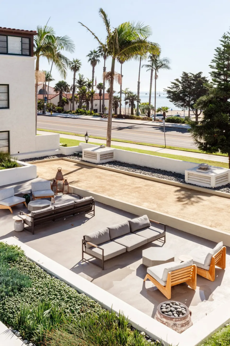 The vine-covered pergola and gurgling Spanish tile fountain of the Ocean Front Terrace offer ocean breezes, intimate seating arrangements, and a large firepit to enjoy Santa Barbara’s perfect weather.